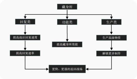 藏身所内的建筑和设施共有20种,大多处于未建造状态,按功能大致分为:回复类、生产类、建造类三种;