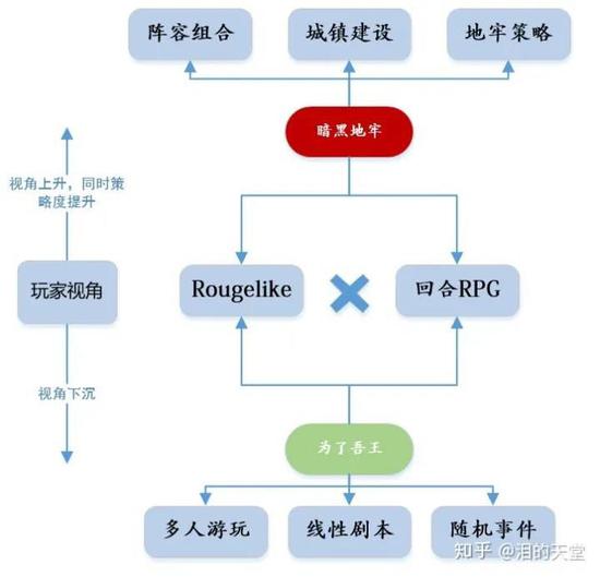 暗黑地牢:让玩家扮演角色上升,以领主身份进行游戏,策略深度、养成广度增加。这样的情况下,阵容组合+城镇建设,地牢选择策略(无论战前选择,还是选择后的物资准备环节)打造为了游戏战斗系统之外的核心玩法。