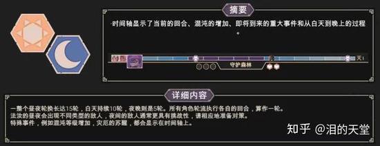 昼夜系统:战棋回合制游戏中加入昼夜系统,并结合时间轴把昼夜、天数、混沌、灾祸等显示糅合在一起,在UI体验、传达上感觉很出色,并且拥有昼夜系统不仅仅只是环境变换,加入夜间怪物增强以及夜市等夜间才能进入场所,让整个游戏的昼夜系统融入冒险的细节之中。