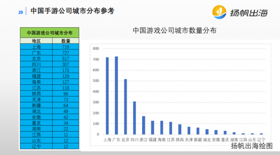对应的其实,我们统计过,前段时间,北京有发了一个文化执法大队开了一个关于版号的会,后来上海和广州也都开了,我们统计了一下,手游公司集中在这几个区域,这是目前手游公司的全国性分布,不是100%准确,但是有一些参照性,时间关系就不多讲了,谢谢大家!