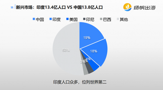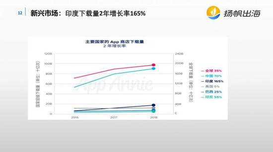 先来看印度,我们看新兴市场,还是看基本面,一般新兴市场的付费率和arpu值比较差,所以需要你有大的DAU,核心是人口,印度有13.4亿,印度有一点和中国很不一样,中国老龄化很严重,但印度没有,平均年龄28岁,比中国年轻很多;对应的,说完人口,再来看看移动互联网的使用情况,中国是从pc时代再到移动端的,印度大部分人接触互联网就是移动互联网,没有pc阶段,是手机互联网的原住民,这一点和中国不太一样;另外一点,看右侧,这两年的新增长率,这两天刚看了AppAnnie从16-19年的增长率,这个表又有一些新的变化,印度市场达到了190%多,全球增长是最快的。