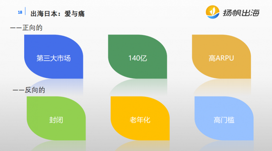 说完印度,我们再来看日本市场,首先我列了正向和反向,每个三个关键词。日本市场,世界第三大市场,大概盘子是140亿美金,一个特点就是arpu值很高,按照应用市场的总支出,它和美国市场其实差不多,美国差不多也是这个数,但会稍微更高一点,但日本人口和国土都很小,达成这样很不容易。