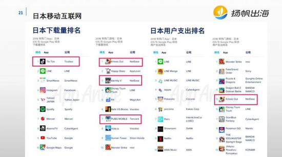 接下来,下载榜,最近的头条抖音非常火,在日本算是做得比较好的,在下载榜首,游戏上主要是腾讯和网易的一些产品,全年都在下载榜爬得比较高。日本用户的支出,也是网易的荒野行动排名比较靠前。