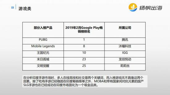 在19年2月份gp畅销榜的一个排名,第一是PUBG,第8是无尽对决,王国纪元在第10等等,在分析印度手游市场时,我们发现多人在线竞技和具备社交属性是这些产品共同的特点,除了吃鸡游戏霸榜之外,像MOBA和国家对抗元素的国产SLG游戏,在印度市场是比较吸金的。