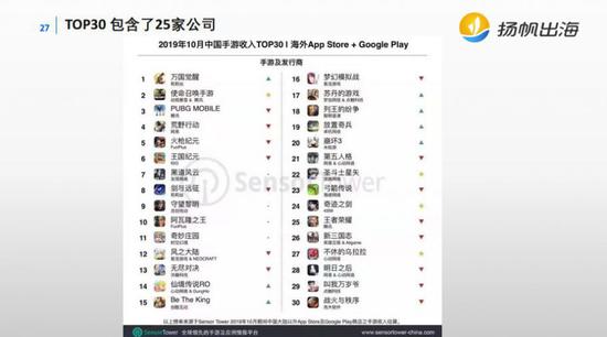 那么我们再来看下19年出海产品的海外收入top榜单,AppStore和Google Play,top30里面包含了25家公司,不是一两家公司占了很多产品,和国内区别很大。