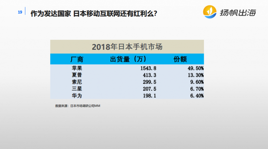 另外实际上,除了它本身盘子还没有怎么下降以外,中国的一些出海品牌,比如华为,在日本不断地爬榜,18年已经是日本出货量第五,去年应该还在继续上升。跟着中国的硬件,华为也提了很多出海方面分成的优惠,包含去做了一个10亿美金的扶持,跟着这些手机硬件出海是有一定红利的。