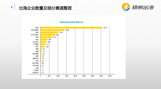 我们刚才说到了明星企业,也看到了低调的公司,现在我们回过头来看整个出海企业的大盘,就我们目前掌握的来看,出海企业有App的这种企业,大概有7600多家,其中游戏占了一半,核心分布在20多个细分的赛道,工具、电商模块比重会比较高。