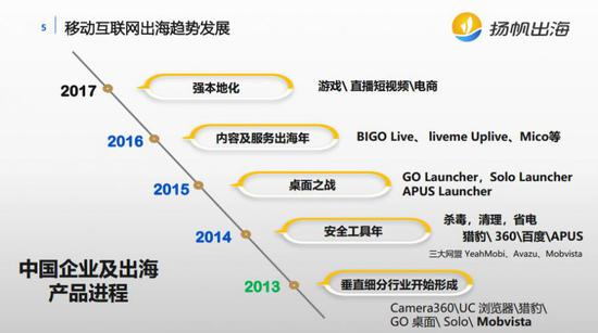 14年这个工具年,是出海安全工具大战,当时是猎豹的高光时刻,猎豹在11年就推出了手机省电应用,13年,猎豹的clean master的下载量其实就已经霸榜全球了。15年的桌面之战,13已经出来了,16年猎豹推出liveme,在美国榜单排名很靠前,开始从工具向做一些转型,说明他们比较早在关注短视频领域,包括之前还做过一个聚合新闻的产品,向内容型产品转变。