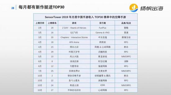 关于游戏出海也好,大的层面互联网的出海,可以关注AppAnnie发布的全球52强,我这里用的是17和18年的,我们专门把涉及到中国的公司摘出来,这两年都是11家公司,对应的代表作也摘了出来,像18年全年,表现比较突出的紫龙游戏和快手,其他都是比较老牌的。