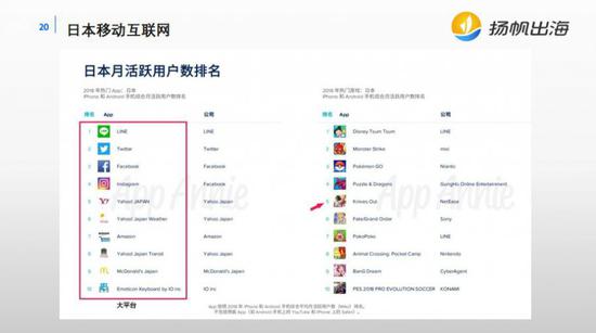 接下来我们讲从软件上,日本的一个月活排名,可以看到和海外很多地方不太一样,谷歌三件套就被本土的产品替换了,比如说whatsapp,就被line取代了,前者是fb的,推特这些在日本比较火,在其他地方没有这么高。然后对应的,像谷歌的产品被雅虎取代了,日本市场是比较独特的,排第九的是麦当劳,麦当劳在任何一个国家都没能爬这么高,在活跃榜单前十很长期,所以大家开玩笑讲,要做日本市场,好好研究一下麦当劳是怎么做的,包括一些本土化的东西,广告投放的颜色搭配,一些设计是怎么弄的,这是一个很有趣的话题。