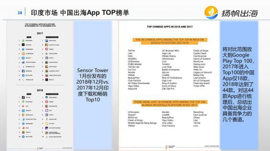 下面这份报告是我们之前和facebook一起发布的白皮书,在讲印度市场入门的情况,在17年,国内应用在榜单前十的还比较少,到18年,榜单前十有一般是中国公司,在收入上,像腾讯的PUBG,也有一个社交直播产品已经爬上了前四,我们再把这样一个数据放大到前100,能看到17年进入top10的只有18款,18年达到了44款,也就是说今年榜单放出来,用户量最大的产品有一半是中国公司。
