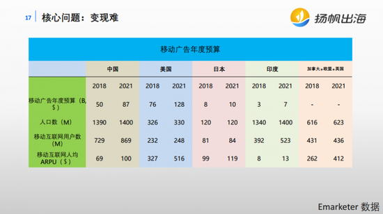 我们再往下接着说,刚才说到用户量大增长快,然后现在国内在当地榜首的产品也很多,那么是不是印度就是一个遍地黄金的市场呢,其实也不是,它是获客便宜,但是变现很难。怎么去理解变现难,苹果手机占比5%,大概就知道这个市场用户还是比较穷的,那是不是可以卖广告呢?我们来看看移动广告的年度预算,18年,整个年度也是很少的,整个年度预算是30亿美金,美国是760亿,中国是500亿,人口虽然和中国差不多,但广告上的费用几乎是国内的二十分之一,10个印度用户抵一个中国用户。
