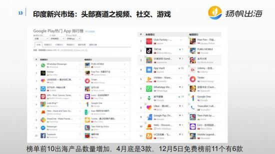 看完这些大盘再来看一下印度市场的产品情况,之前有做这样一个表,也是从AppAnnie截的,榜单前十持续在增加,原来19年4月已经有明显的中国产品比较多了,对应前十的有3款,免费榜其实更多,11个里面有6个,都是中国公司,像club factory,基本上被列入了印度国内最受欢迎App的品牌,甚至比抖音还靠前,是一个当地电商。