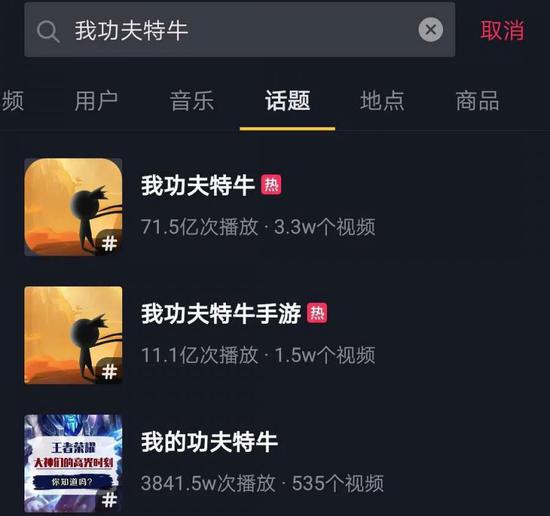 以上线5个月至今,仍然稳居iOS免费榜Top 20的《我功夫特牛》为例。通过“武侠”、“魔性”等文案梗和抖音短视频传播,该作打造了2019年休闲游戏神话,根据统计《我功夫特牛》相关话题视频数超3.3万,总计曝光在71.5亿以上。