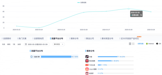 而在投放媒体分布上,抖音占53.42%的《宝剑大师》广告投放素材占比,西瓜视频占比36.99%,头条占比7.53%,以及占比较少的火山小视频和皮皮虾。