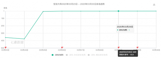 值得提出的是,从七麦数据提供的IOS游戏免费榜来看,《宝剑大师》自3月24日起处于快速上升趋势,并于3月29日登顶免费榜。