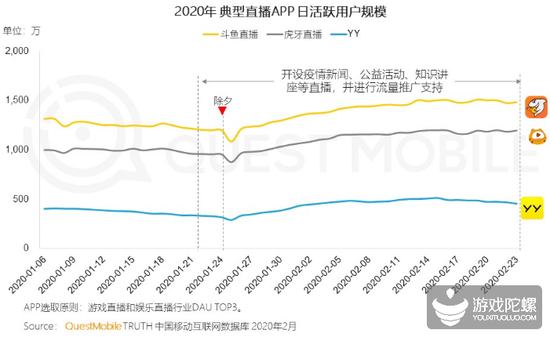 根据QuestMobile发布的《中国移动直播行业“战疫”专题报告》中的数据显示,由于假期以及疫情的影响,斗鱼、虎牙等直播平台的日活量自春节后均有所提升。