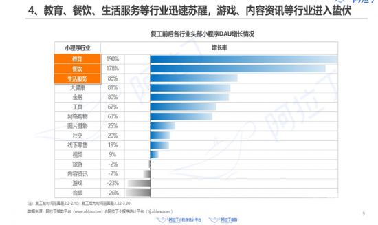 据阿拉丁指数统计,随着疫情好转,日常工作和生活进入正常节奏,宅家期间热度大为降低的餐饮、生活服务和工具类小程序,都在3月份开始了回暖,餐饮小程序DAU增长达到了178%,上午11点为餐饮类小程序的使用高峰。