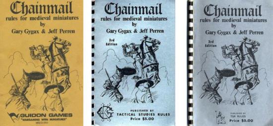 一群普鲁士军官在进行‘Kriegsspiel’推演,图源: Adalbert von Rößler 的木雕画,1884 年1971 年,在威斯康星州日内瓦湖市,战棋游戏社区的一名成员发布了一个小游戏,意在帮助战棋玩家模拟中世纪战斗。《Chainmail(链甲)》由 Gary Gygax 和 Jeff Perren 最初创造,其中包含一个小型奇幻拓展,为长期以来完全依赖于模拟历史战争的战棋游戏注入了全新的概念。