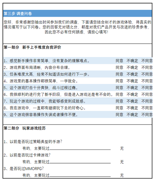 使用定量调研,需要保证测试样本的基本数量。而往往有范围的玩家测试,是样本有限的情况,切不可直接导出结果,而仅仅可作为辅助参考内容。而这种情况,问卷设计也不应该以调查大量群体数据为主要目标,而是对测试样本进行更为深入的分析和玩家行为的快速记录。比如针对某个玩家记录他在不同玩法的体验反馈对比,玩家对某种操作的反应速度反应态度等。更可以作为后续深入访谈的切入话题。