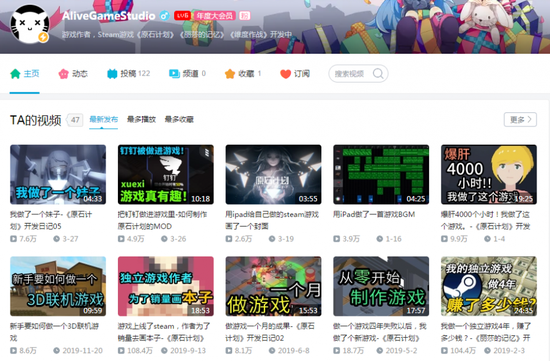 Alive第一次开播在2014年,为了记录自己游戏开发的过程,所以在B站发布了《我的游戏开发日记》。目前一共投稿了48个视频,视频主要是游戏开发的日志,还有一些开发心得的分享。