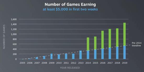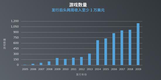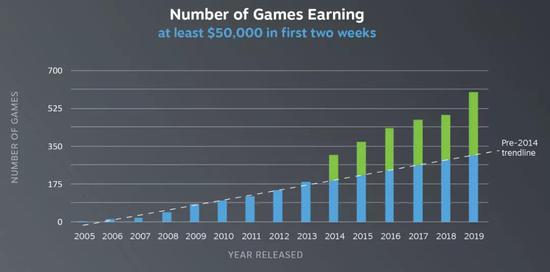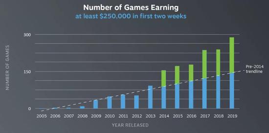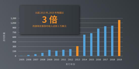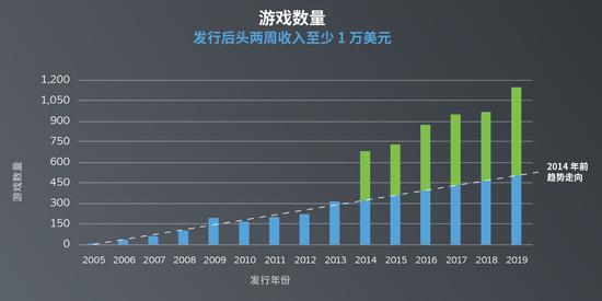 1万美元的门槛是个相当随意的起点,为了确保分析结果并非偶然,我们同时也测试了更高和更低的门槛以及不同的时间范围。在各种情况下,我们都发现了相似的规律。 举例来说,2019 年发行头两周收入超过 5000 美元的游戏数量是 2013 年的 4 倍还多,收入超过 25 万美元的新游戏则是 3 倍多。 大家可以在我们的研究说明中找到此基准和其他基准的相关图表。
