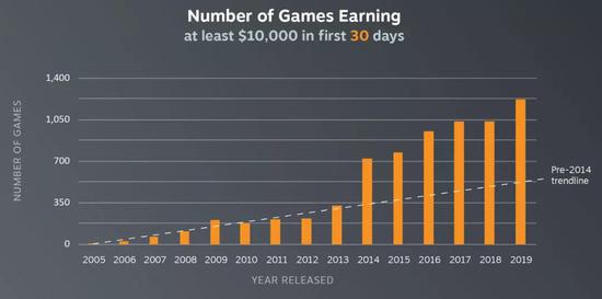 大家可能还注意到了图表上 2013 年与 2014 年之间出现的大幅攀升。 这反映出我们自2013年8月起在 Steam 上所接受的游戏数量的增长。 这其中许多游戏并未立即准备好发行,因此这一增长的效应仅在2014年才真正开始显现。比起2013年,2019年有超过3倍的新品达到了1万美元的基准。