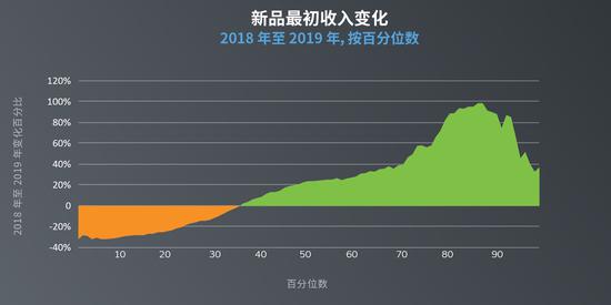 总体来说,我们发现第 35 个百分位数以上的新品在 2019 年比 2018 年收入更多, 而在 35 个百分位数以下的则收入更少。