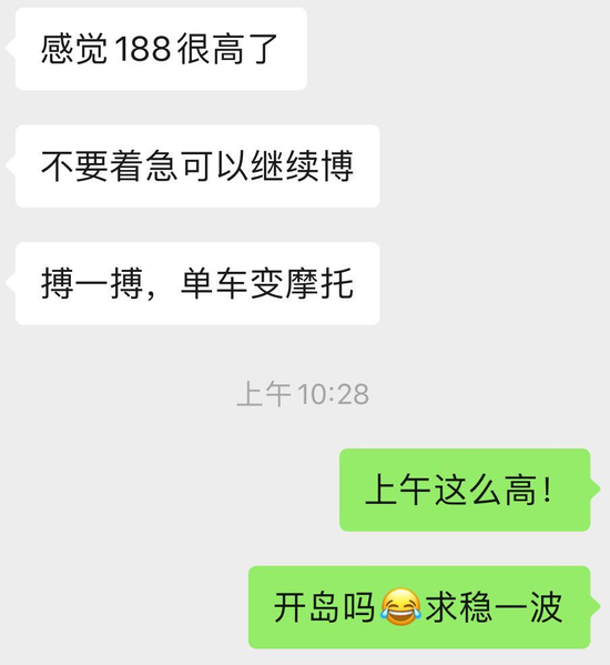 3。 分享自己的心理状态。面对频繁变化的市场,每个人心中都会交替涌现出贪婪和恐惧。那种等待菜价上涨,可周六发现价格直接触底的绝望;在群聊中找到高菜价大佬的绝处逢生;上午刚刚以200块清仓,下午却又涨到400块的后悔……