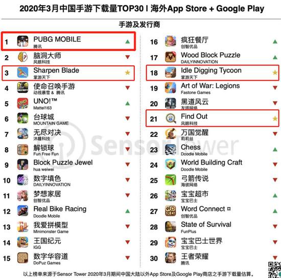 出海下载榜方面,得益于二周年和第12赛季开启的推动,《PUBG MOBILE》成功拿到了下载榜冠军。3月份共有三款新游戏入榜,分别是掌游天下超休闲游戏《Sharpen Blade》和放置游戏《Idle Digging Tycoon》,以及风眼科技的超休闲游戏《Find Out》。
