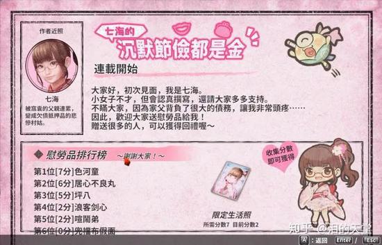 同样,在救出七海前,七海在海报上与玩家进行互动也是亮点,玩家能得到不同的慰劳品,并进行排行,在救出七海后,七海的样貌会根据玩家送出的礼物而变化。