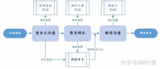 主线剧情很简单,从为娶老婆为岳父还债,到岳父要求巨额聘礼,最后引诱岳父打造金雕像继续还债,玩家通过还债->地牢赚取原材料->交易赚钱(模拟经营),形成循环,主线剧情不停还债/要钱的剧情,很明显是为了玩法体验服务。