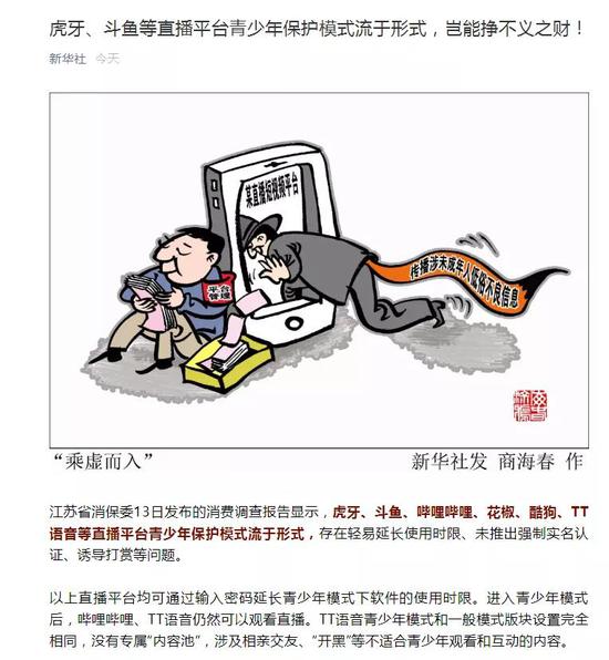 新华社指出,一些直播平台青少年保护模式流于形式,存在轻易延长使用时限、未推出强制实名认证、诱导打赏等问题。