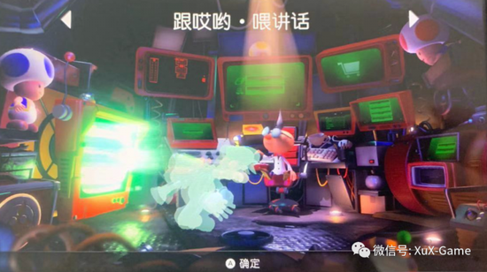 并且在进入功能界面时,界面包装也是一个电视机,配色包装视觉都与入口相结合,给玩家感受非常连贯自然。全局导航与玩法和场景相结合,让玩家有“从何来”的认知,不用引导自然就知道如何操作。在救出奇诺比奥之后他们会在场景里与路易吉互动,比如进工作室时会sayhello,切换功能时奇诺比奥他们的动作和眼神也会对应变化,沉浸感的创意设计非常棒了!