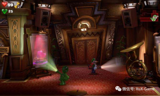 第二步是路易吉通过电影播放器穿梭去其他房间,把需要的道具放入对应房间进行操作后进行下一步探索(中间的大房间是主线,四个分通暗影播放器4号房间,玩家通过播放器进行穿梭)