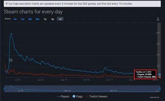 根据Steamdb显示,《刀塔霸业》在刚推出时拥有近18万的在线人数,其巅峰期共有19万玩家同时在线,而到2020年1月份这个数值只有13000左右,还在持续下滑。