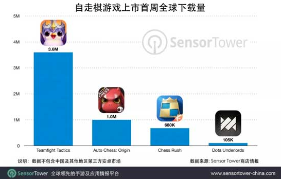 以该品类里如日中天的拳头《云顶之弈》为例,从《英雄联盟》开始置入自走棋模式,再到3月19日《云顶之弈》移动端正式上市。数据方面,该作移动端首周在App Store和Google Play的下载量达 360万次,全球总下载量已超 450万次。