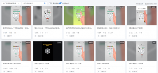 通过在AppGrowing观察Ohayoo近期两款超休闲产品《宝剑大师》、《别针大师》的买量素材,可以发现针对“超休闲”产品投放时,Ohayoo的素材选择显得十分直接,几乎均以单刀直入呈现游戏内容为主,旨在用最短的时间最简单的画面将游戏乐趣及特色展示给玩家,与《我功夫特牛》、《小兵别嚣张》等中重度休闲手游的阶梯式推广策略并不一致。