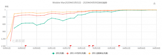 此后的2月13日,在海外势如破竹的《Draw Climber》已同时跻身103个国家TOP10之列,但《画个腿快跑》却仅位列国区iOS免费榜第212名,直至一个月后的3月19日才首次进入免费榜TOP10,但却又在不到一周的时间里掉出前十,截止发稿前已滑落至50名以外。