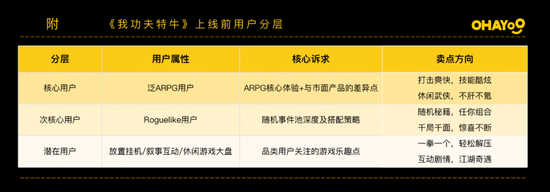 据项目笔记显示,《我功夫特牛》其实早在立项期便确定了结合ACT、Roguelike、RPG三大元素进行设计,也借此预埋了打动不同玩家的分层卖点,此后的推广策略正是根据发行节奏一步步的对不同用户圈层进行渗透。