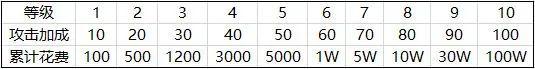 以5级作为分水岭来看,提升到5级一共花了5000,获得了50点攻击力,每点攻击力价值100;提升到10级总共花费了100W,每点攻击力价值1W。