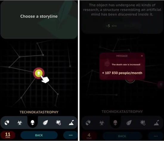 和《瘟疫公司》一样,玩家还会在游戏过程中遇到不同的事件,比如从天而降的神秘盒子、意外爆发的事故等等,都会影响灾难剧情的发展。但不同的是,《Apocalypse Inc。》没有让玩家进化病毒,而是升华剧情的方式提高死亡率,与前者的病毒感染题材有着异曲同工之妙。