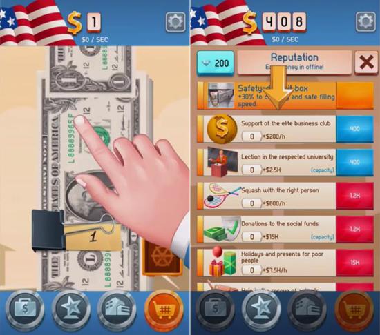 这是一款经营题材的放置游戏,但你在这款游戏里既不是打怪,也不是挖矿,而是点击屏幕数钱,达到一定数额可以解锁功能,比如在新手教学阶段,200美元可以解锁建筑功能,你可以购买房屋、曼哈顿酒店、展览中心等建筑。