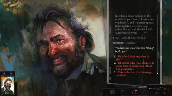 而更关键的是,这是一种桌游式的扮演感。得益于文字这一成本低廉的呈现形式,游戏为玩家准备了海量内容。玩家在游戏里探索到的每一个地点,对话的每一个NPC都可能会为玩家带来全新的对话和事件,玩家通过大量的选项来予以回应。这个游戏的C&C非常内敛而微妙。在这个游戏里没有黑曜石游戏那样摆明车马让你挑边站的选择,也没有事先让玩家就知道可能后果的两难之选。一切选择都跟现实生活中一样,玩家无法预知后果,只能像现实生活中一样小心权衡。而小心权衡的基础就是耐心细致地阅读游戏中的文字和对话,听取你的各项技能以及队友金叔给你的建议,通过真正合理的选择推进游戏的进程。