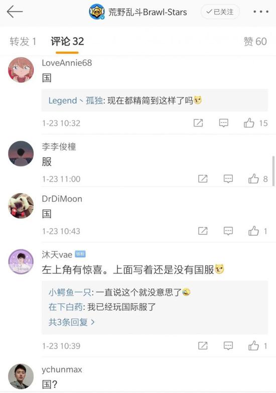 但因为种种因素,它在今年三月才拿到版号。在漫长的等待时间里,《荒野乱斗》的官方微博下面也产生了独特的催国服文化,有时候甚至简化成一个字:“国?”