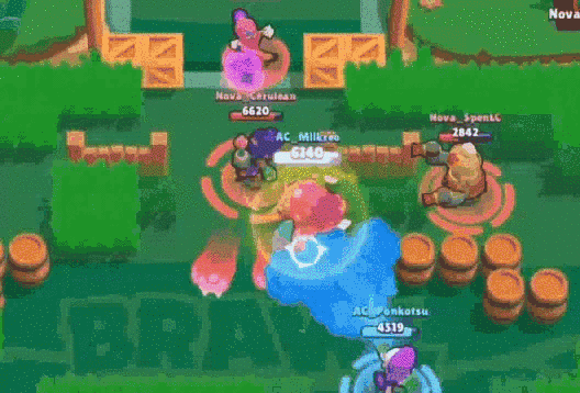 这就让《荒野乱斗》的战斗非常像是“击剑”。因为伤害太高,双方交战前会有很长的互相试探时间。但是一旦围绕地图机制开打,往往非常短的时间内对决就结束了,加上大招造成的伤害会给大招重复充能,团战场面会非常激烈。