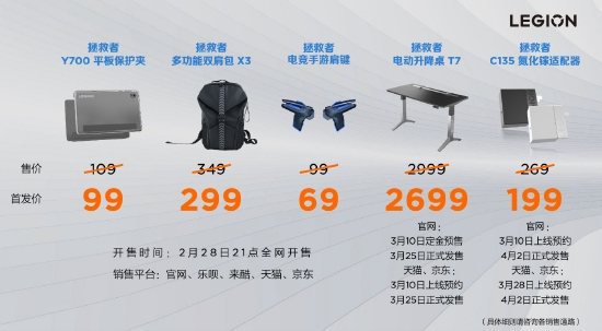 具有3挡高度记忆的拯救者电动升降桌T7,采用1600N强动力双电机架构,噪音小、升降快,还有遇阻回弹、童锁等功能;20L大容量的拯救者多功能双肩包X3,内含3分区 +17隔袋,耐磨防泼溅,创新可折叠包体结构可轻松收纳;300W次按压寿命的拯救者电竞手游肩键,可帮助玩家实现多指操作,单秒连发,一键超神,并附赠银纤维指套;全新磁吸拆分的拯救者Y700平板保护夹,可两档高度调节、智能唤醒休眠,高清高透的材质,更能还原机器美感。135W 峰值功率的拯救者C135氮化镓适配器,融合 PD/QC/PPS 多种快充协议,兼容多设备使用。