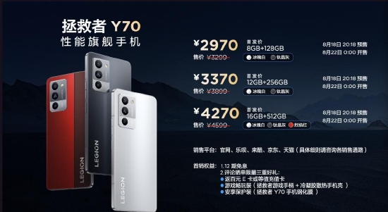 拯救者Y70性能旗舰手机8+128GB版本首发价2970元,12+256GB版本首发价3370元,16+512GB版本首发价4270元,将于8月18日20时18分在联想官网、乐呗、来酷、京东、天猫等平台预售,8月22日0时开售。