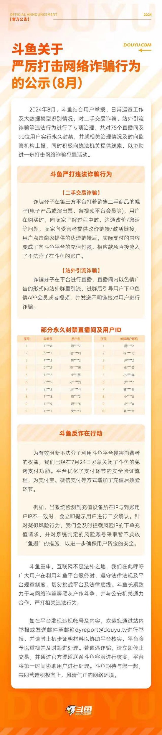 近期,针对用户反馈发现有不法分子利用斗鱼平台进行诈骗的情况,斗鱼迅速响应,持续开展了严格的排查与治理行动。9月20日,斗鱼发布了《斗鱼关于严厉打击网络诈骗行为的公示(8月)》。经过深入核查,8月内,斗鱼共永久封禁了75个涉嫌违规的直播间及90位违规用户账号,有效遏制了诈骗活动的蔓延。同时,斗鱼及时向监管机构上报了相关情况,并积极向执法机关提供线索,严厉打击利用平台服务进行网络诈骗的犯罪活动。