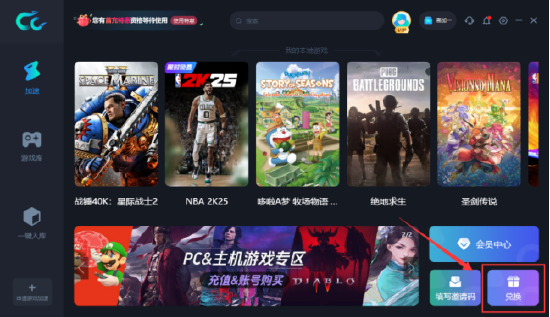 浏览器搜索“CC加速器官网”下载安装CC加速器PC电脑版,打开后右下角有兑换专区,输入兑换码CCJSQ999,即可兑换成功。兑换成功后会弹窗提示